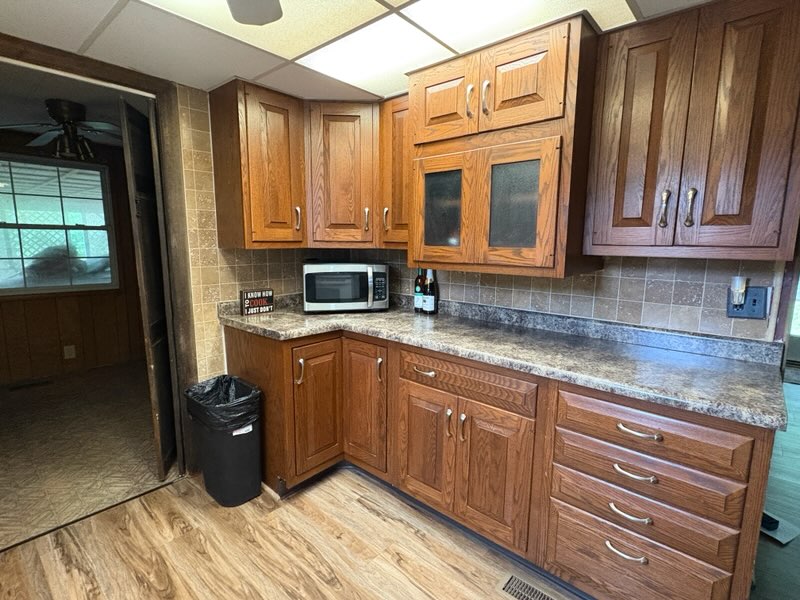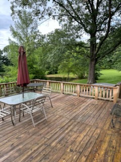 - Large deck overlooking backyard & pond